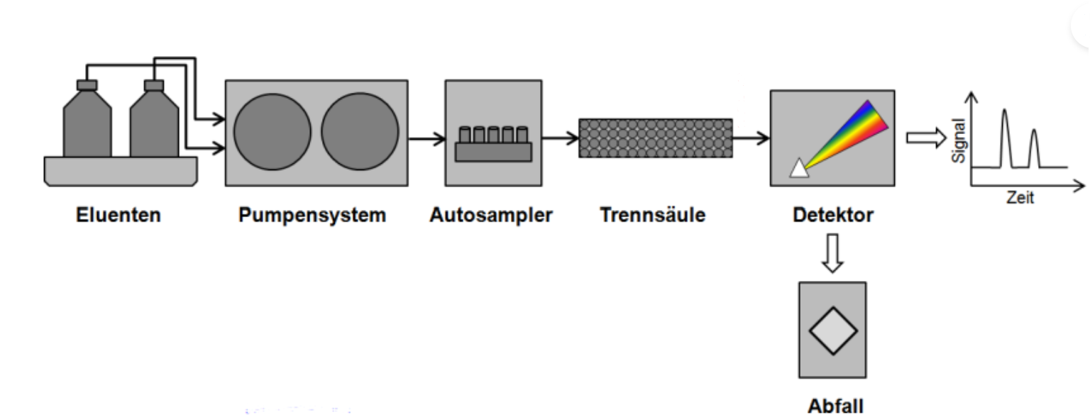 HPLC steht für high perfomance liquid chromatography und gehört zu den analytischen Trennverfahren zur Identitäts-, Reinheits- und Gehaltsprüfung. Die zu untersuchende Substanz wird dabei mit der mobilen Phase durch eine Trennsäule, welche die stationäre Phase enthält, gepumpt. Je nach Analyten können unterschiedliche Trennmechanismen gewählt werden: Normal-Phase (polare Substanzen), Reversed-Phase (unpolare Substanzen), Trennung nach Molekülgröße (Größenausschluss), Trennung nach Ladung (Ionenaustausch) oder Trennung nach Affinität zu einem Liganden. 8